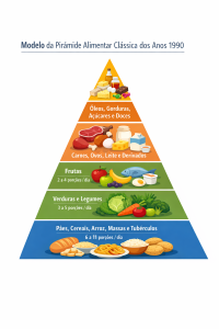No segundo nível, recomendava-se o consumo de 3 a 5 porções de verduras e de 2 a 4 porções de frutas por dia. Já no terceiro nível, as proteínas — como carnes, peixes e ovos — eram consideradas importantes, mas não ocupavam o centro da dieta. No topo, as gorduras, especialmente as saturadas, eram vistas como vilãs e deveriam ser consumidas com moderação.